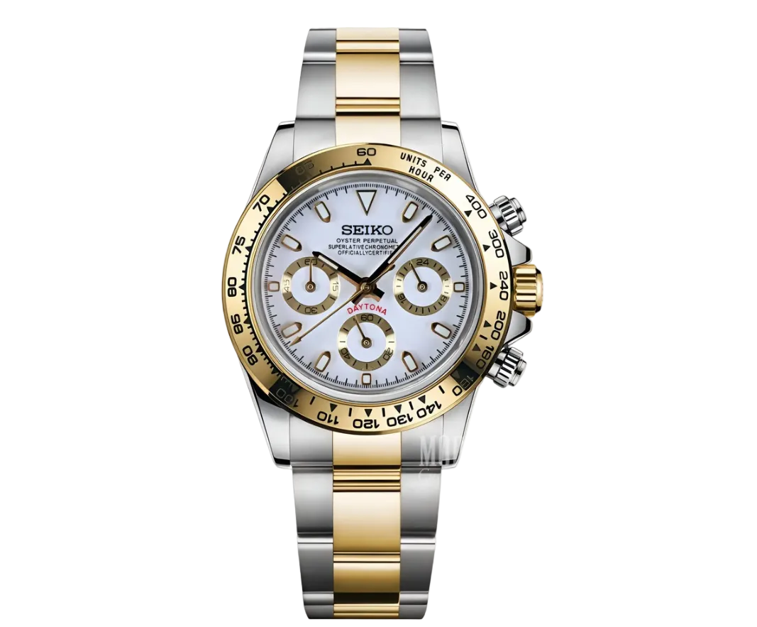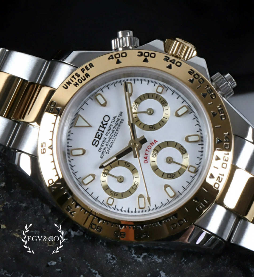 Seiko Daytona Silver Gold — sofisticado, llamativo y perfectamente equilibrado, combinando el brillo del acero plateado con detalles dorados que aportan contraste, lujo y presencia deportiva.
