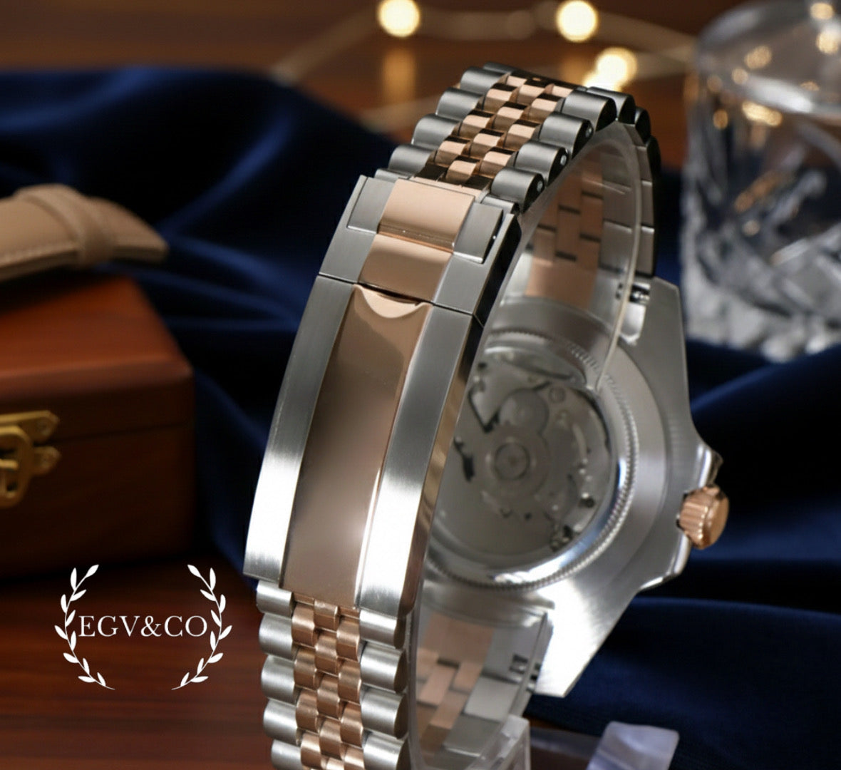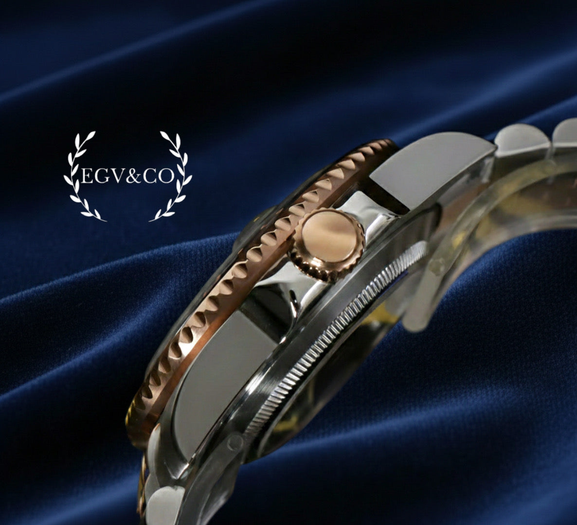 Un Seiko GMT Rootbeer — elegante, cálido y sofisticado, combinando el contraste clásico del negro con el marrón y el brillo del oro rosa para una presencia potente y refinada.