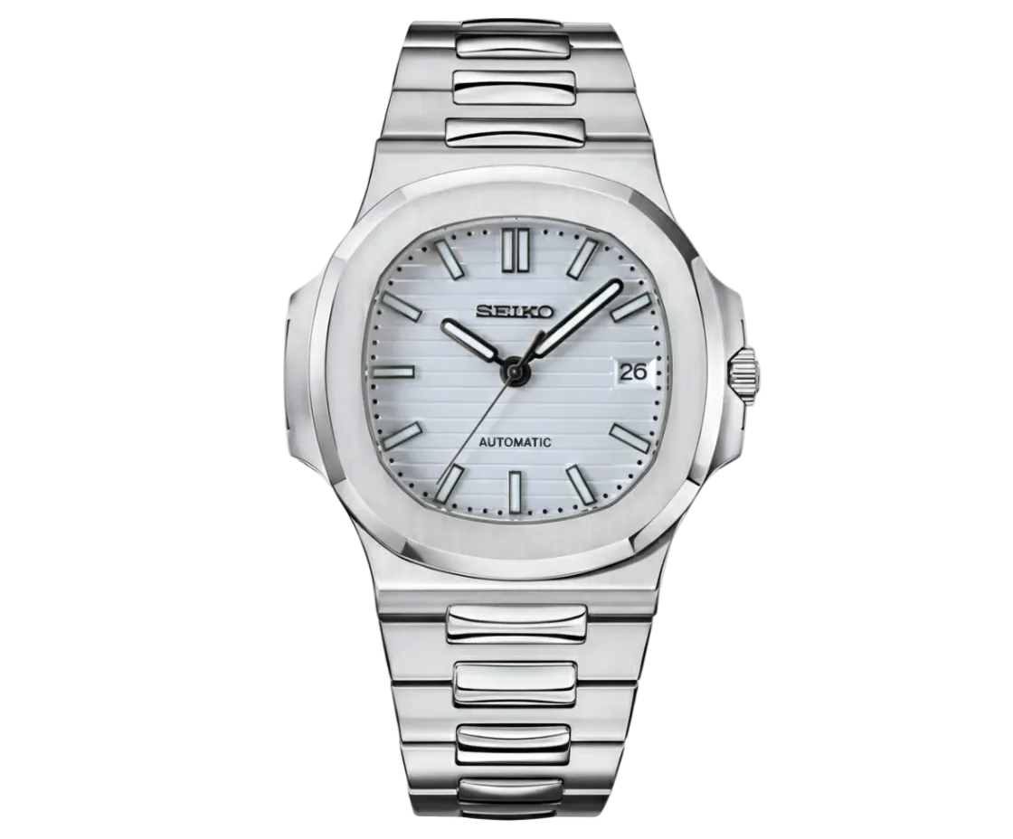 Seiko Nautilus White — elegante y deportivo, este reloj combina la precisión clásica de Seiko con un diseño inspirado en los icónicos relojes de lujo estilo Nautilus. Su esfera blanca aporta claridad y sofisticación, ofreciendo máxima legibilidad y un estilo versátil, ideal tanto para uso diario como para ocasiones formales.